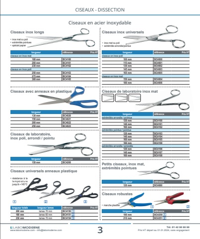 1 2 33 T%u00e9l. 01 42 50 50 50www.labomoderne.com - [email protected] Prix HT d%u00e9part au 01.01.2024, sans engagementLABOMODERNEPetits ciseaux, inox mat, extr%u00e9mit%u00e9s pointuesCiseaux de laboratoire, inox poli, arrondi / pointuCiseaux avec anneaux en plastiqueCiseaux en acier inoxydable1 2longueur r%u00e9f%u00e9rence Prix HTciseaux en inox mat180 mm BC4160 200 mm BC4161 230 mm BC4162 ciseaux en inox poli250 mm BC4163 275 mm BC4164 300 mm BC4165 longueur r%u00e9f%u00e9rence Prix HTciseaux en inox poli100 mm BC4000 115 mm BC4001 130 mm BC4002 145 mm BC4003 165 mm BC4005 ciseaux en inox mat150 mm BC4004 180 mm BC4006 longueur r%u00e9f%u00e9rence Prix HTextr%u00e9mit%u00e9s arrondie / pointue120 mm BC4100 140 mm BC4101 160 mm BC4102 extr%u00e9mit%u00e9s pointue / pointue120 mm BC4103 140 mm BC4104 160 mm BC4105 180 mm BC4109extr%u00e9mit%u00e9s arrondie / arrondie120 mm BC4106 140 mm BC4107 160 mm BC4108 longueur r%u00e9f%u00e9rence Prix HT120 mm BC4080 longueur r%u00e9f%u00e9rence Prix HT190 mm BC4250 1 210 mm BC4251 2 longueur totale longueur lames r%u00e9f%u00e9rence Prix HT200 mm lames 70 mm BC4150 1 180 mm lames 60 mm BC4151 2 230 mm lames 70 mm BC4154 3 longueur r%u00e9f%u00e9rence Prix HT150 mm BC4200 longueur r%u00e9f%u00e9rence Prix HT130 mm BC4020 150 mm BC4021 200 mm BC4022 250 mm BC4023 Ciseaux inox longs Ciseaux inox universelsCiseaux robustesCiseaux universels anneaux plastiqueCiseaux de laboratoire inox mat%u2022 inox mat ou poli%u2022 extr%u00e9mit%u00e9s pointues%u2022 sp%u00e9cial papier %u2022 inox mat ou poli%u2022 extr%u00e9mit%u00e9s arrondie/pointue%u2022 r%u00e9sistance %u00e0 la t e m p %u00e9 r a t u r e jusqu'%u00e0 +145%u00b0C%u2022%u0009 manche plastifi%u00e9CISEAUX - DISSECTION