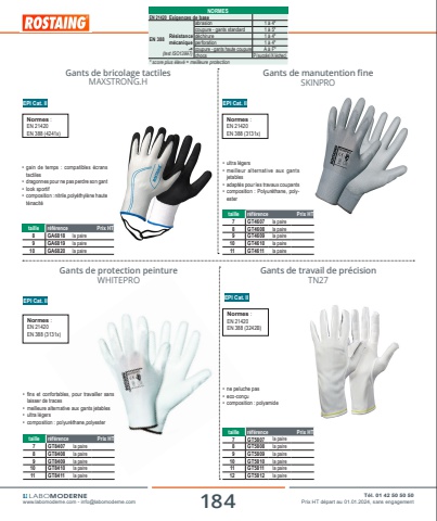 184 T%u00e9l. 01 42 50 50 50www.labomoderne.com - [email protected] Prix HT d%u00e9part au 01.01.2024, sans engagementLABOMODERNEGants de bricolage tactilesMAXSTRONG.HEPI Cat. IINormes :EN 21420EN 388 (4241x)%u2022 gain de temps : compatibles %u00e9crans tactiles%u2022 dragonnes pour ne pas perdre son gant%u2022 look sportif%u2022 composition : nitrile,poly%u00e9thyl%u00e8ne haute t%u00e9nacit%u00e9taille r%u00e9f%u00e9rence Prix HT 8 GA6818 la paire9 GA6819 la paire10 GA6820 la pairetaille r%u00e9f%u00e9rence Prix HT7 GT4607 la paire8 GT4608 la paire9 GT4609 la paire10 GT4610 la paire11 GT4611 la paireGants de manutention fineSKINPRO%u2022 ultra l%u00e9gers%u2022 meilleur alternative aux gants jetables%u2022 adapt%u00e9s pour les travaux coupants%u2022 composition : Polyur%u00e9thane, polyester Normes :EN 21420EN 388 (3131x)EPI Cat. IIGants de protection peinture WHITEPROtaille r%u00e9f%u00e9rence Prix HT7 GT8407 la paire 8 GT8408 la paire 9 GT8409 la paire10 GT8410 la paire11 GT8411 la paire%u2022 fins et confortables, pour travailler sans laisser de traces%u2022 meilleure alternative aux gants jetables%u2022 ultra l%u00e9gers%u2022 composition : polyur%u00e9thane,polyesterEPI Cat. IINormes :EN 21420EN 388 (3131x)Gants de travail de pr%u00e9cisionTN27%u2022 ne peluche pas%u2022 eco-con%u00e7u%u2022 composition : polyamideNormes :EN 21420EN 388 (3242B)taille r%u00e9f%u00e9rence Prix HT7 GT5807 la paire8 GT5808 la paire9 GT5809 la paire10 GT5810 la paire11 GT5811 la paire12 GT5812 la paireEPI Cat. IINORMESEN 21420 Exigences de baseEN 388 R%u00e9sistance m%u00e9caniqueabrasion 1 %u00e0 4*coupure - gants standard 1 %u00e0 5*d%u00e9chirure 1 %u00e0 4*perforation 1 %u00e0 4*coupure - gants haute coupure A %u00e0 F*chocs P(succ%u00e8s)X(%u00e9chec)* score plus %u00e9lev%u00e9 = meilleure protection(test ISO13997)r