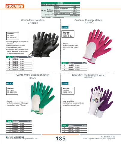 185 T%u00e9l. 01 42 50 50 50www.labomoderne.com - [email protected] Prix HT d%u00e9part au 01.01.2024, sans engagementLABOMODERNEtaille r%u00e9f%u00e9rence Prix HT 6 GT1206 la paire 7 GT1207 la paire 8 GT1208 la paire 9 GT1209 la paire10 GT1210 la paireGants multi-usages en latexBASIC%u2022 bon grip %u2022 protection de la paume et des doigts%u2022 composition : Latex, PolycotonEPI Cat. IINormes :EN 21420EN 388 (2142x)Gants fins multi-usages latex NERINE%u2022 fins et confortables%u2022 excellent grip en toute circonstance.%u2022 composition : latex,polyesterEPI Cat. IItaille r%u00e9f%u00e9rence Prix HT6 GA8506 la paire7 GA8507 la paire8 GA8508 la paireNormes :EN 21420EN 388 (1121x)Gants multi-usages latex FUSHIAEPI Cat. IINormes :EN 21420EN 388 (2142x)%u2022 bon grip%u2022 protection paume et doigts%u2022 composition latex, polycotontaille r%u00e9f%u00e9rence Prix HT 6 GA6906 la paire7 GA6907 la paire8 GA6908 la pairetaille r%u00e9f%u00e9rence Prix HT6 GT3206 la paire 7 GT3207 la paire8 GT3208 la paire 9 GT3209 la paire10 GT3210 la paire11 GT3211 la paireGants d'interventionGP-INTER%u2022 mod%u00e8le agr%u00e9%u00e9 par le minist%u00e8re de l'int%u00e9rieur%u2022 bonne r%u00e9istance %u00e0 la coupure%u2022 compatible %u00e9cran tactile%u2022 composition : Fleur de caprin, coton, fibres min%u00e9rales, para-aramide, poly%u00e9thyl%u00e8ne haute t%u00e9nacit%u00e9Normes :EN 21420EN 388 (3x32C)NORMESEN 21420 Exigences de baseEN 388 R%u00e9sistance m%u00e9caniqueabrasion 1 %u00e0 4*coupure - gants standard 1 %u00e0 5*d%u00e9chirure 1 %u00e0 4*perforation 1 %u00e0 4*coupure - gants haute coupure A %u00e0 F*chocs P(succ%u00e8s)X(%u00e9chec)* score plus %u00e9lev%u00e9 = meilleure protection(test ISO13997)r