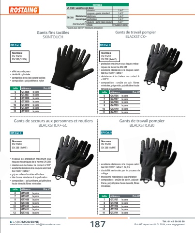 187 T%u00e9l. 01 42 50 50 50www.labomoderne.com - [email protected] Prix HT d%u00e9part au 01.01.2024, sans engagementLABOMODERNEGants de travail pompier BLACKSTICK+Normes :EN 21420EN 388 (4x44F)%u2022 protection maximum aux risques m%u00e9caniques de la norme EN 388%u2022 excellente r%u00e9sistance %u00e0 la coupure selon test ISO 13997 : lettre F%u2022 r%u00e9sistance %u00e0 la chaleur de contact %u00e0 +100%u00b0C%u2022 composition : cro%u00fbte de cuir, fibres min%u00e9rales, polyamide, poly%u00e9thyl%u00e8ne haute t%u00e9nacit%u00e9,polyur%u00e9thanetaille r%u00e9f%u00e9rence Prix HT6 GA7706 la paire7 GA7707 la paire8 GA7708 la paire9 GA7709 la paire10 GA7710 la paire11 GA7711 la paireEPI Cat. II Gants de secours aux personnes et routiers BLACKSTICK+-SCEPI Cat. IINormes :EN 21420EN 388 (4x44F)taille r%u00e9f%u00e9rence Prix HT6 GT7406 la paire 7 GT7407 la paire 8 GT7408 la paire 9 GT7409 la paire10 GT7410 la paire11 GT7411 la paire12 GT7412 la pairetaille r%u00e9f%u00e9rence Prix HT7 GT2707 la paire 8 GT2708 la paire9 GT2709 la paire10 GT2710 la paire11 GT2711 la paireGants de travail pompierBLACKSTICK30Normes :EN 21420EN 388 (4x44F)EPI Cat. II%u2022 niveaux de protection maximum aux risques m%u00e9caniques de la norme EN 388%u2022 r%u00e9sistance %u00e0 la chaleur de contact %u00e0 100%u00b0 %u2022 excellente r%u00e9sistance %u00e0 la coupure selon test ISO 13997 : lettre F%u2022 grip en milieux humides et huileux%u2022 tr%u00e8s bonne r%u00e9sistance %u00e0 la perforation%u2022 composition : polyur%u00e9thane,poly%u00e9thyl%u00e8ne haute t%u00e9nacit%u00e9,fibres min%u00e9rales%u2022 excellente r%u00e9sistance %u00e0 la coupure selon test ISO 13997 : lettre F, 32,1 N%u2022 durabilit%u00e9 renforc%u00e9e par le process de collage%u2022 tr%u00e8s bonne r%u00e9sistance %u00e0 la perforation%u2022 composition : cro%u00fbte de bovin, polyur%u00e9thane, poly%u00e9thyl%u00e8ne haute densit%u00e9, fibres min%u00e9ralesGants fins tactilesSKINTOUCHtaille r%u00e9f%u00e9rence Prix HT6 GT2806 la paire 7 GT2807 la paire8 GT2808 la paire 9 GT2809 la paire10 GT2810 la paire11 GT2811 la paire12 GT2812 la paire%u2022 effet seconde peau%u2022 dext%u00e9rit%u00e9 optimis%u00e9e%u2022 compatible avec les %u00e9crans tactiles%u2022 composition : polyur%u00e9thane, nylonEPI Cat. IINormes :EN 21420EN 388 (3131A)NORMESEN 21420 Exigences de baseEN 388 R%u00e9sistance m%u00e9caniqueabrasion 1 %u00e0 4*coupure - gants standard 1 %u00e0 5*d%u00e9chirure 1 %u00e0 4*perforation 1 %u00e0 4*coupure - gants haute coupure A %u00e0 F*chocs P(succ%u00e8s)X(%u00e9chec)* score plus %u00e9lev%u00e9 = meilleure protection(test ISO13997)r