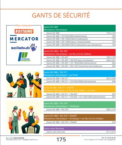 175 T%u00e9l. 01 42 50 50 50www.labomoderne.com - [email protected] Prix HT d%u00e9part au 01.01.2024, sans engagementLABOMODERNEGants EN 388 R%u00e9sistance m%u00e9caniqueGants EN 388 176 %u00e0 193Gants EN 388 + CE1935/2004 (alimentaire) 194Gants EN 388 + EN 16350 (%u00e9lectrostatiques) 194Gants EN 388 + EN 13594 (pour motocyclistes) 194Gants EN 388 + ISO10819:2016 (r%u00e9sistance aux vibrations) 194Gants EN 388 + EN 407 R%u00e9sistance m%u00e9canique + au feu et %u00e0 la chaleurGants EN 388 + EN 407 195 %u00e0 199Gants EN 388 + EN 407 + EN 659 (pour pompiers) 200 %u00e0 201Gants EN 388 + EN 407 + CE 1935/2004 (alimentaire) 202Gants EN 388 + EN 407 + EN 1247 (machines de fonderies) 202Gants EN 388 + EN 511R%u00e9sistance m%u00e9canique + au froidGants EN 388 + EN 511 203 %u00e0 206Gants EN 388 + EN 511 + CE1935/2004 (alimentaire) 206Gants EN 388 + EN 511 + EN 407R%u00e9sistance m%u00e9canique + au feu et %u00e0 la chaleur + au froidGants EN 388 + EN 511 + EN 407 207Gants EN 388 + EN 511 + EN 407 + CE 1935/2004 (alimentaire) 207Gants EN 388 + EN 374R%u00e9sistance m%u00e9canique + chimiqueGants EN 388 + EN 374 208 %u00e0 210Gants EN 388 + EN 374 + EN407R%u00e9sistance m%u00e9canique + chimique + au feu et %u00e0 la chaleurGants EN 388 + EN 374 + EN407 210Gants sans NormesGants sans Normes 211 %u00e0 215Nos marquesGANTS DE S%u00c9CURIT%u00c9
