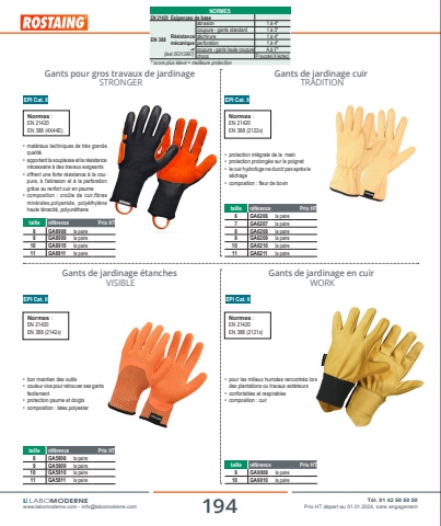 194 T%u00e9l. 01 42 50 50 50www.labomoderne.com - [email protected] Prix HT d%u00e9part au 01.01.2024, sans engagementLABOMODERNEGants pour gros travaux de jardinage STRONGER%u2022 mat%u00e9riaux techniques de tr%u00e8s grande qualit%u00e9%u2022 apportent la souplesse et la r%u00e9sistance n%u00e9cessaire %u00e0 des travaux exigeants%u2022 offrent une forte r%u00e9sistance %u00e0 la coupure, %u00e0 l'abrasion et %u00e0 la perforation gr%u00e2ce au renfort cuir en paume%u2022 composition : cro%u00fbte de cuir,fibres min%u00e9rales,polyamide, poly%u00e9thyl%u00e8ne haute t%u00e9nacit%u00e9, polyur%u00e9thaneEPI Cat. IItaille r%u00e9f%u00e9rence Prix HT8 GA8908 la paire9 GA8909 la paire10 GA8910 la paire11 GA8911 la paireNormes :EN 21420EN 388 (4X44E)Gants de jardinage en cuir WORK%u2022 pour les milieux humides rencontr%u00e9s lors des plantations ou travaux ext%u00e9rieurs %u2022 confortables et respirables%u2022 composition : cuirEPI Cat. IItaille r%u00e9f%u00e9rence Prix HT9 GA9009 la paire10 GA9010 la paireNormes :EN 21420EN 388 (2121x)Gants de jardinage cuir TRADITIONEPI Cat. II%u2022 protection int%u00e9grale de la main%u2022 protection prolong%u00e9e sur le poignet%u2022 le cuir hydrofuge ne durcit pas apr%u00e8s le s%u00e9chage%u2022 composition : fleur de bovintaille r%u00e9f%u00e9rence Prix HT 6 GA6206 la paire7 GA6207 la paire8 GA6208 la paire9 GA6209 la paire10 GA6210 la paire11 GA6211 la paireNormes :EN 21420EN 388 (2122x)Gants de jardinage %u00e9tanches VISIBLEEPI Cat. IINormes :EN 21420EN 388 (2142x)%u2022 bon maintien des outils%u2022 couleur vive pour retrouver ses gants facilement%u2022 protection paume et doigts%u2022 composition : latex,polyestertaille r%u00e9f%u00e9rence Prix HT 8 GA5808 la paire9 GA5809 la paire10 GA5810 la paire11 GA5811 la paireNORMESEN 21420 Exigences de baseEN 388 R%u00e9sistance m%u00e9caniqueabrasion 1 %u00e0 4*coupure - gants standard 1 %u00e0 5*d%u00e9chirure 1 %u00e0 4*perforation 1 %u00e0 4*coupure - gants haute coupure A %u00e0 F*chocs P(succ%u00e8s)X(%u00e9chec)* score plus %u00e9lev%u00e9 = meilleure protection(test ISO13997)r