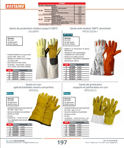 197 T%u00e9l. 01 42 50 50 50www.labomoderne.com - [email protected] Prix HT d%u00e9part au 01.01.2024, sans engagementLABOMODERNEGants de protection coupure et perforation en cuirRIPEUR/COtaille r%u00e9f%u00e9rence Prix HT 7 GT2207 la paire8 GT2208 la paire 9 GT2209 la paire10 GT2210 la paire11 GT2211 la paire12 GT2212 la paire%u2022 excellente r%u00e9sistance %u00e0 la coupure selon test ISO 13997 : lettre F, 61,4 N%u2022 tr%u00e8s bonne r%u00e9sistance %u00e0 la perforation%u2022 barri%u00e8re aux huiles%u2022 bon grip%u2022 composition : Cro%u00fbte de bovin, inox, poly%u00e9thyl%u00e8ne haute densit%u00e9, polyamideEPI Cat. IINormes :EN 21420EN 388 (4x44F)EN 407 (x1xxxx)Gants de protection chaleur jusqu'%u00e0 350%u00b0COILGRIP5%u2022 excellente r%u00e9sistance %u00e0 la coupure selon test ISO 13997 : lettre F, 42 N%u2022 r%u00e9sistance %u00e0 la flamme et %u00e0 la chaleur de contact %u00e0 350%u00b0%u2022 grip conserv%u00e9 en milieu huileux%u2022 composition : Para-aramide, cro%u00fbte de bovin, silicone, coton, fibres min%u00e9ralesNormes :EN 21420EN 388 (4x34F)EN 407 (43xxxx)taille r%u00e9f%u00e9rence Prix HT8 GT5108 la paire9 GT5109 la paire10 GT5110 la paire11 GT5111 la paireGants anti-chaleur 500%u00b0C aluminis%u00e9PROFUSION-1Normes :EN 21420EN 388 (4x44D)EN 407 (444444)taille r%u00e9f%u00e9rence Prix HT6 GT6206 la paire7 GT6207 la paire8 GT6208 la paire9 GT6210 la paire10 GT6206 la paire11 GT6211 la paire12 GT6212 la paire%u2022 adapt%u00e9s %u00e0 la manipulation de pi%u00e8ces %u00e9lectroniques%u2022 utilisables en milieu %u00e9lectrostatique%u2022 compatibles avec %u00e9crans tactiles%u2022 r%u00e9sistance aux petites coupures%u2022 composition : Polyur%u00e9thane, poly%u00e9thyl%u00e8ne haute t%u00e9nacit%u00e9, carboneEPI Cat. IIIGants en cuir sp%u00e9cial barbel%u00e9s rasoirs concertinaRIPDEXGtaille r%u00e9f%u00e9rence Prix HT7 GT2007 la paire 8 GT2008 la paire 9 GT2009 la paire10 GT2010 la paire11 GT2011 la paire%u2022 excellente r%u00e9sistance %u00e0 la coupure selon test ISO 13997 : lettre F, 62 N%u2022 tr%u00e8s bonne r%u00e9sistance %u00e0 la perforation%u2022 barri%u00e8re aux huiles%u2022 bon grip%u2022 composition : cro%u00fbte de bovin, inox, poly%u00e9thyl%u00e8ne haute densit%u00e9, polyamideEPI Cat. IINormes :EN 21420EN 388 (4x44F)EN 407 (x1xxxx)NORMESEN 21420 Exigences de baseEN 388 R%u00e9sistance m%u00e9caniqueabrasion 1 %u00e0 4*coupure - gants standard 1 %u00e0 5*d%u00e9chirure 1 %u00e0 4*perforation 1 %u00e0 4*coupure - gants haute coupure A %u00e0 F*chocs P(succ%u00e8s)X(%u00e9chec)EN 407R%u00e9sistance %u00e0 la chaleur et au feuinflammabilit%u00e9 1 %u00e0 4*chaleur de contact 1 %u00e0 4*chaleur par convection 1 %u00e0 4*chaleur radiante 1 %u00e0 4*petites projections de m%u00e9tal en fusion 1 %u00e0 4*projections de m%u00e9tal en fusion 1 %u00e0 4** score plus %u00e9lev%u00e9 = meilleure protection(test ISO13997)r