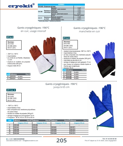 205 T%u00e9l. 01 42 50 50 50www.labomoderne.com - [email protected] Prix HT d%u00e9part au 01.01.2024, sans engagementLABOMODERNEtaille r%u00e9f%u00e9rence Prix HT10 CK1210 la paire11 CK1211 la paire%u2022 -200%u00b0C %u00e0 +150%u00b0C%u2022 imperm%u00e9ables%u2022 en cro%u00fbte de cuir flexible, d'%u00e9paisseur 1,2 mm%u2022 doublure en molleton de polyester multicouches (240 g/m%u00b2)%u2022 longueur totale 38 cmGants cryog%u00e9niques -196%u00b0Cen cuir, usage intensifNormes :EN 21420EN 388 (3243)EN 511 (231)%u2022 r%u00e9sistent %u00e0 des temp%u00e9ratures -196%u00b0C %u00e0 +150%u00b0C%u2022 imperm%u00e9ables %u00e0 l'eau%u2022 en tissu composite avec membrane polyur%u00e9thane de couleur bleue %u2022 doublure en molleton de polyester (240 g/m%u00b2)%u2022 manchette de s%u00e9curit%u00e9 en cuir%u2022 serrage et r%u00e9glage par auto-agrippant, 15 cm%u2022 pour travaux en pr%u00e9sence d'azote liquide et d'autres gaz cryog%u00e9niques%u2022 longueur 38 cmtaille r%u00e9f%u00e9rence Prix HT8 CK1281 la paire9 CK1282 la paire10 CK1283 la paire11 CK1284 la paireGants cryog%u00e9niques -196%u00b0Cmanchette en cuirEPI Cat. IIINormes :EN 21420EN 388 (1342)EN 511 (221)EPI Cat. IIIGants cryog%u00e9niques -196%u00b0Cjusqu'%u00e0 65 cm%u2022 -196%u00b0C %u00e0 +150%u00b0C%u2022 imperm%u00e9ables %u00e0 l'eau%u2022 tissu composite avec membrane polyur%u00e9thane de couleur bleue %u2022 doublure en molleton de polyester (240 g/m%u00b2) %u2022 serrage et r%u00e9glage par auto-agrippant 15 cm%u2022 4 longueurs : 38 cm, 45 cm, 55 cm ou 65 cmNormes :EN 21420EN 388 (1242)EN 511 (241)EPI Cat. IIItaille r%u00e9f%u00e9rence Prix HT r%u00e9f%u00e9rence Prix HT r%u00e9f%u00e9rence Prix HT r%u00e9f%u00e9rence Prix HTlongueur 38 cm longueur 45 cm longueur 55 cm longueur 65 cm7 CK1240 CK1250 - -8 CK1241 CK1251 CK1261 CK12719 CK1242 CK1252 CK1262 CK127210 CK1243 CK1253 CK1263 CK127311 CK1244 CK1254 CK1264 CK1274NORMESEN 21420 Exigences de baseEN 388 R%u00e9sistance m%u00e9caniqueabrasion 1 %u00e0 4*coupure - gants standard 1 %u00e0 5*d%u00e9chirure 1 %u00e0 4*perforation 1 %u00e0 4*coupure - gants haute coupure A %u00e0 F*chocs P(succ%u00e8s)X(%u00e9chec)EN 511 R%u00e9sistance au froidfroid par convection 1 %u00e0 4*froid de contact 1 %u00e0 4*imperm%u00e9abilit%u00e9 %u00e0 l'eau 0 ou 1** score plus %u00e9lev%u00e9 = meilleure protection