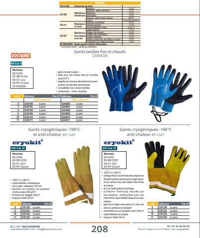 208 T%u00e9l. 01 42 50 50 50www.labomoderne.com - [email protected] Prix HT d%u00e9part au 01.01.2024, sans engagementLABOMODERNEtaille r%u00e9f%u00e9rence Prix HT8 CK1330 la paire9 CK1331 la paire10 CK1332 la paire11 CK1333 la paireGants cryog%u00e9niques -196%u00b0Canti-chaleur en cuir%u2022 -200%u00b0C %u00e0 +250%u00b0C%u2022 prot%u00e8ge main et avant-bras des projections d'azote liquide et autres gaz cryog%u00e9niques, et du contact avec des objets ultra-froids et chauds%u2022 en cuir trait%u00e9 sp%u00e9cial hydrofuge %u2022 protection thermique assur%u00e9e par une doublure multicouches avec une membrane imperm%u00e9able laissant la peau respirer%u2022 paume et doigts recouverts d'un tissu de silicone adh%u00e9rent et r%u00e9sistant%u2022 manchette en cuir ajustable avec Velcro%u00ae%u2022 imperm%u00e9ables et souples%u2022 longueur totale 38 cmtaille r%u00e9f%u00e9rence Prix HT8 CK1230 la paire9 CK1231 la paire10 CK1232 la paire11 CK1233 la paireGants cryog%u00e9niques -196%u00b0Cet anti-chaleur en cuir%u2022 -200%u00b0C %u00e0 +250%u00b0C%u2022 imperm%u00e9ables, antistatiques%u2022 cuir %u00e0 grain, %u00e9paisseur 0,9 mm%u2022 doublure en molleton de polyester multicouches (240 g/m%u00b2)%u2022 fermeture et r%u00e9glage Velcro%u00ae%u2022 longueur totale 38 cmNormes :EN 21420EN 388 (2222)EN 511 (231)EN 407 (x2xxxx)EPI Cat. III EPI Cat. IIINormes :EN 21420EN 388 (3332)EN 511 (221)EN 407 (x2xxxx)EPI - GANTSNORMESEN 21420 Exigences de baseEN 388 R%u00e9sistance m%u00e9caniqueabrasion 1 %u00e0 4*coupure - gants standard 1 %u00e0 5*d%u00e9chirure 1 %u00e0 4*perforation 1 %u00e0 4*coupure - gants haute coupure A %u00e0 F*chocs P(succ%u00e8s)X(%u00e9chec)EN 511 R%u00e9sistance au froidfroid par convection 1 %u00e0 4*froid de contact 1 %u00e0 4*imperm%u00e9abilit%u00e9 %u00e0 l'eau 0 ou 1*EN 407R%u00e9sistance %u00e0 la chaleur et au feuinflammabilit%u00e9 1 %u00e0 4*chaleur de contact 1 %u00e0 4*chaleur par convection 1 %u00e0 4*chaleur radiante 1 %u00e0 4*petites projections de m%u00e9tal en fusion 1 %u00e0 4*projections de m%u00e9tal en fusion 1 %u00e0 4*CE1935/2004 Gants agr%u00e9%u00e9s contact alimentaire* score plus %u00e9lev%u00e9 = meilleure protectionGants tactiles fins et chaudsCANADA%u2022 gants de demi-saison%u2022 id%u00e9al pour les milieux frais et humides jusqu'%u00e0 0%u00b0C%u2022 adapt%u00e9s aux travaux abrasifs et %u00e0 la manipulation de denr%u00e9es alimentaires%u2022 compatibles avec %u00e9crans tactiles%u2022 composition : nitrile, acryliqueNormes :EN 21420EN 388 (4131x)EN 511 (x1x)EN 407 (x1xxxx)CE1935/2004EPI Cat. IItaille r%u00e9f%u00e9rence Prix HT r%u00e9f%u00e9rence Prix HTSANS dragonne AVEC dragonne 6 GA4706 la paire GA4806 la paire 7 GA4707 la paire GA4807 la paire8 GA4708 la paire GA4808 la paire9 GA4709 la paire GA4809 la paire10 GA4710 la paire GA4810 la paire11 GA4711 la paire GA4811 la paire