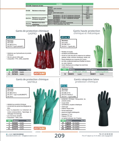 209 T%u00e9l. 01 42 50 50 50www.labomoderne.com - [email protected] Prix HT d%u00e9part au 01.01.2024, sans engagementLABOMODERNEGants haute protection chimique et m%u00e9caniqueNormes :EN 21420EN 388 (2121)EN 374-1 : Type B (JKL)Gants de protection chimiqueGASPROtaille r%u00e9f%u00e9rence Prix HT9 GT4209 la paire10 GT4210 la paire%u2022 r%u00e9sistance aux hydrocarbures et produits chimiques%u2022 tr%u00e8s bon grip en milieu gras%u2022 composition : PVC, nitrile, polyamideNormes :EN 21420EN 388 (4131x)EN 374-1: Type A (AKLMPT)Gants de protection chimiqueSNITRILEtaille r%u00e9f%u00e9rence Prix HT 7 GA4207 la paire8 GA4208 la paire9 GA4209 la paire10 GA4210 la paire%u2022 r%u00e9sistant aux produits chimiques%u2022 conviennent aux personnes allergiques au latex%u2022 pour la pr%u00e9paration du traitement de culture phytosanitaire, l'%u00e9pandage, le nettoyage et le lessivage%u2022 pour les travaux abrasifs%u2022 composition : nitrile, cotonEPI Cat. IINormes :EN 21420EN 388 (4101x)EN 374-1: Type A (AJKLMNOPT)EN 374-5EPI Cat. IIItaille r%u00e9f%u00e9rence Prix HTM LMS340 les 10 pairesL LMS341 les 10 pairesXL LMS342 les 10 pairesXXL LMS343 les 10 pairesGants n%u00e9opr%u00e8ne latexprotection chimique%u2022 protection chimique, manipulation de produits acides%u2022 coupe droite%u2022 confortables, souples et %u00e9lastiques%u2022 coloris gris%u2022 int%u00e9rieur floqu%u00e9 coton%u2022 forme anatomique%u2022 paume et doigts antid%u00e9rapants%u2022 %u00e9paisseur 0,7 mm%u2022 longueur 310 mm%u2022 en sachet individuel, les 10 pairesNormes :EN 21420EN 388 (3110)EN 374-2 Niveau 2EN 374-1 : Type B (ABK)EPI Cat. IIINORMESEN 21420 Exigences de baseEN 388 R%u00e9sistance m%u00e9caniqueabrasion 1 %u00e0 4*coupure - gants standard 1 %u00e0 5*d%u00e9chirure 1 %u00e0 4*perforation 1 %u00e0 4*coupure - gants haute coupure A %u00e0 F*chocs P(succ%u00e8s)X(%u00e9chec)EN 374-1 R%u00e9sistance aux produits chimiques dangereuxEN374-2 p%u00e9n%u00e9tration > 30 min 6 substances chimiques Type A p%u00e9n%u00e9tration > 30 min 3 substances chimiques Type B p%u00e9n%u00e9tration > 10 min 1 substance chimique Type CEN16523 perm%u00e9ationEN374-4 d%u00e9gradation chimiqueEN 374-5 R%u00e9sistance aux microorganismesEN374-5 p%u00e9n%u00e9tration des micro-organismesEN374-5 VIRUS p%u00e9n%u00e9tration des Virus* score plus %u00e9lev%u00e9 = meilleure protectiontaille r%u00e9f%u00e9rence Prix HT r%u00e9f%u00e9rence Prix HTmod%u00e8le court : 370 mm mod%u00e8le long 600 mm10 B25070 la paire B25071 la paire%u2022 flexibles et souples%u2022 excellente sensibilit%u00e9 tactile%u2022 travail en toute s%u00e9curit%u00e9 en pr%u00e9sence de mati%u00e8res grasses, huiles, solutions caustiques, acides, etc.%u2022 haute r%u00e9sistance aux coupures et %u00e0 l'usure%u2022 en nitrile, rev%u00eatement externe en Rubiflex%u00ae et interne en coton Interlock%u2022 revers %u00e9lastique pour prot%u00e9ger les avant-bras%u2022 mod%u00e8le court ou longEPI Cat. III