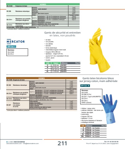 211 T%u00e9l. 01 42 50 50 50www.labomoderne.com - [email protected] Prix HT d%u00e9part au 01.01.2024, sans engagementLABOMODERNEGants de s%u00e9curit%u00e9 et entretienen latex, non poudr%u00e9s%u2022 en latex%u2022 non poudr%u00e9s%u2022 non st%u00e9riles%u2022 textur%u00e9s%u2022 forme anatomique%u2022 manchettes longues %u00e0 bord roul%u00e9%u2022 longueur 250 %u00e0 280 mm%u2022 %u00e9paisseur : doigts 0,24 mm, paume 0,21 mm, manchette 0,16 mm%u2022 coloris : jaune%u2022 la pairetaille largeur r%u00e9f%u00e9rence Prix HTS 70-90 mm GA1907M 85-105 mm GA1908L 100-120 mm GA1909XL %u2265 110 mm GA1910Normes :EN 21420EN 374-2EPI Cat. INORMESEN 21420 Exigences de baseEN 388 R%u00e9sistance m%u00e9caniqueabrasion 1 %u00e0 4*coupure - gants standard 1 %u00e0 5*d%u00e9chirure 1 %u00e0 4*perforation 1 %u00e0 4*coupure - gants haute coupure A %u00e0 F*chocs P(succ%u00e8s)X(%u00e9chec)EN 374-1 R%u00e9sistance aux produits chimiques dangereuxEN374-2 p%u00e9n%u00e9tration > 30 min 6 substances chimiques Type A p%u00e9n%u00e9tration > 30 min 3 substances chimiques Type B p%u00e9n%u00e9tration > 10 min 1 substance chimique Type CEN16523 perm%u00e9ationEN374-4 d%u00e9gradation chimiqueEN 374-5 R%u00e9sistance aux microorganismesEN374-5 p%u00e9n%u00e9tration des micro-organismesEN374-5 VIRUS p%u00e9n%u00e9tration des VirusCE1935/2004 Gants agr%u00e9%u00e9s contact alimentaire* score plus %u00e9lev%u00e9 = meilleure protectionNORMESEN 21420 Exigences de baseEN 388 R%u00e9sistance m%u00e9caniqueabrasion 1 %u00e0 4*coupure - gants standard 1 %u00e0 5*d%u00e9chirure 1 %u00e0 4*perforation 1 %u00e0 4*coupure - gants haute coupure A %u00e0 F*chocs P(succ%u00e8s)X(%u00e9chec)EN 374-1 R%u00e9sistance aux produits chimiques dangereuxEN374-2 p%u00e9n%u00e9tration > 30 min 6 substances chimiques Type A p%u00e9n%u00e9tration > 30 min 3 substances chimiques Type B p%u00e9n%u00e9tration > 10 min 1 substance chimique Type CEN16523 perm%u00e9ationEN374-4 d%u00e9gradation chimiqueEN 374-5 R%u00e9sistance aux microorganismesEN374-5 p%u00e9n%u00e9tration des micro-organismesEN374-5 VIRUS p%u00e9n%u00e9tration des VirusEN 407R%u00e9sistance %u00e0 la chaleur et au feuinflammabilit%u00e9 1 %u00e0 4*chaleur de contact 1 %u00e0 4*chaleur par convection 1 %u00e0 4*chaleur radiante 1 %u00e0 4*petites projections de m%u00e9tal en fusion 1 %u00e0 4*projections de m%u00e9tal en fusion 1 %u00e0 4** score plus %u00e9lev%u00e9 = meilleure protectionGants latex bicolores bleus sur jersey coton, main adh%u00e9ris%u00e9e%u2022 int%u00e9rieur : jersey coton%u2022 ext%u00e9rieur adh%u00e9ris%u00e9 : tr%u00e8s bonne pr%u00e9hension des objets%u2022 bords droits%u2022 longueur 300 mm%u2022 %u00e9paisseur 1,4 mm%u2022 tr%u00e8s bonne r%u00e9sistance %u00e0 l%u2019abrasion%u2022 emballage individuelNormes :EN 21420EN 388 (4131x)EN 374-1: Type A (AKLMNPST)EN 374-4EN 374-5EN407 (x2xxxx)EPI Cat. IIItaille r%u00e9f%u00e9rence Prix HTS PR9107 les 10 pairesM PR9108 les 10 pairesL PR9109 les 10 pairesXL PR9110 les 10 pairesXXL PR9111 les 10 paires