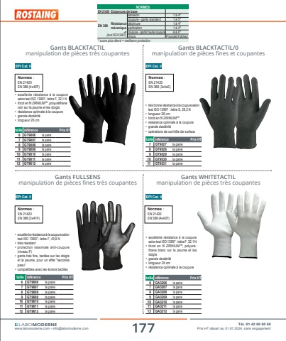 177 T%u00e9l. 01 42 50 50 50www.labomoderne.com - [email protected] Prix HT d%u00e9part au 01.01.2024, sans engagementLABOMODERNEtaille r%u00e9f%u00e9rence Prix HT 7 GT9027 la paire 8 GT9028 la paire 9 GT9029 la paire10 GT9030 la paire11 GT9031 la paireGants BLACKTACTIL/0manipulation de pi%u00e8ces fines et coupantes%u2022 tr%u00e8s bonne r%u00e9sistance %u00e0 la coupure selon test ISO 13997 : lettre E, 28,2 N%u2022 longueur 26 cm%u2022 tricot en fil ZIRNIUMTM%u2022 r%u00e9sistance optimale %u00e0 la coupure%u2022 grande dext%u00e9rit%u00e9%u2022 op%u00e9rations de contr%u00f4le de surfaceEPI Cat. IINormes :EN 21420EN 388 (3x4xE)Gants BLACKTACTILmanipulation de pi%u00e8ces tr%u00e8s coupantestaille r%u00e9f%u00e9rence Prix HT 6 GT9006 la paire 7 GT9007 la paire 8 GT9008 la paire 9 GT9009 la paire10 GT9010 la paire11 GT9011 la paire12 GT9012 la paire%u2022 excellente r%u00e9sistance %u00e0 la coupure selon test ISO 13997 : lettre F, 32,1 N%u2022 tricot en fil ZIRNIUMTM, polyur%u00e9thane noir sur la paume et les doigts%u2022 r%u00e9sistance optimale %u00e0 la coupure%u2022 grande dext%u00e9rit%u00e9%u2022 longueur 26 cmEPI Cat. IIGants WHITETACTILmanipulation de pi%u00e8ces tr%u00e8s coupantestaille r%u00e9f%u00e9rence Prix HT 6 GA3206 la paire 7 GA3207 la paire 8 GA3208 la paire 9 GA3209 la paire10 GA3210 la paire11 GA3211 la paire12 GA3212 la paireEPI Cat. II%u2022 excellente r%u00e9sistance %u00e0 la coupure selon test ISO 13997 : lettre F, 32,1 N%u2022 tricot en fil ZIRNIUMTM, polyur%u00e9thane blanc sur la paume et les doigts%u2022 grande dext%u00e9rit%u00e9%u2022 longueur 26 cm%u2022 r%u00e9sistance optimale %u00e0 la coupureNormes :EN 21420EN 388 (4x42F)taille r%u00e9f%u00e9rence Prix HT 6 GT9606 la paire 7 GT9607 la paire 8 GT9608 la paire 9 GT9609 la paire10 GT9610 la paire11 GT9611 la paire12 GT9612 la paireGants FULLSENS manipulation de pi%u00e8ces fines tr%u00e8s coupantesEPI Cat. II%u2022 excellente r%u00e9sistance %u00e0 la coupure selon test ISO 13997 : lettre F, 43,9 N%u2022 tr%u00e8s r%u00e9sistant%u2022 protection maximale anti-coupure (niveau F)%u2022 gants tr%u00e8s fins, tactiles sur les doigts et la paume, pour un effet \peau\%u2022 compatibles avec les %u00e9crans tactilesNormes :EN 21420EN 388 (3x41F)Normes :EN 21420EN 388 (4x42F)NORMESEN 21420 Exigences de baseEN 388 R%u00e9sistance m%u00e9caniqueabrasion 1 %u00e0 4*coupure - gants standard 1 %u00e0 5*d%u00e9chirure 1 %u00e0 4*perforation 1 %u00e0 4*coupure - gants haute coupure A %u00e0 F*chocs P(succ%u00e8s)X(%u00e9chec)* score plus %u00e9lev%u00e9 = meilleure protection(test ISO13997)r