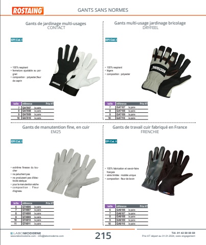 215 T%u00e9l. 01 42 50 50 50www.labomoderne.com - [email protected] Prix HT d%u00e9part au 01.01.2024, sans engagementLABOMODERNEGANTS SANS NORMESGants de jardinage multi-usages CONTACT%u2022 100% respirant%u2022 fermeture ajustable au poignet%u2022 composition : polyester,fleur de caprintaille r%u00e9f%u00e9rence Prix HT7 GA7007 la paire8 GA7008 la paire9 GA7009 la paire10 GA7010 la paireGants multi-usage jardinage bricolage DRYFEEL%u2022 100% respirant%u2022 l%u00e9gers%u2022 composition : polyestertaille r%u00e9f%u00e9rence Prix HT7 GA7107 la paire8 GA7108 la paire9 GA7109 la paire10 GA7110 la paireEPI Cat. I EPI Cat. IGants de travail cuir fabriqu%u00e9 en FranceFRENCHIEEPI Cat. II%u2022 100% fabrication et savoir-faire fran%u00e7ais%u2022 s%u00e9rie limit%u00e9e : mod%u00e8le unique%u2022 composition : fleur de bovintaille r%u00e9f%u00e9rence Prix HT 6 GA6106 la paire7 GA6107 la paire8 GA6108 la paire9 GA6109 la paire10 GA6110 la pairetaille r%u00e9f%u00e9rence Prix HT6 GT4806 la paire7 GT4807 la paire8 GT4808 la paire9 GT4809 la paire10 GT4810 la paire11 GT4811 la paireGants de manutention fine, en cuirEM25%u2022 extr%u00eame finesse du toucher%u2022 ne peluchent pas%u2022 ne produisent pas d'%u00e9lectricit%u00e9 statique%u2022 pour la manutention s%u00e8che%u2022 composition : Fleur d'agneauEPI Cat. I
