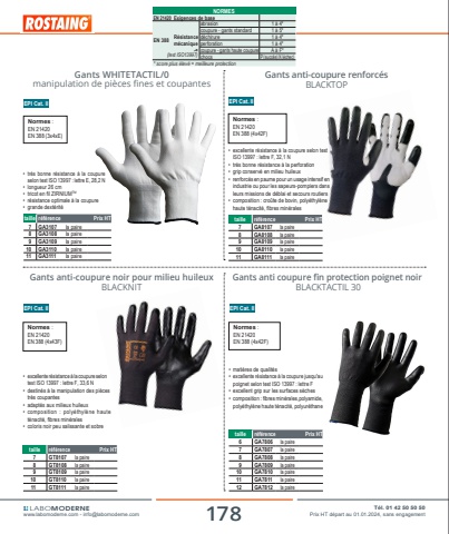 178 T%u00e9l. 01 42 50 50 50www.labomoderne.com - [email protected] Prix HT d%u00e9part au 01.01.2024, sans engagementLABOMODERNEtaille r%u00e9f%u00e9rence Prix HT 7 GA3107 la paire 8 GA3108 la paire 9 GA3109 la paire10 GA3110 la paire11 GA3111 la paireGants WHITETACTIL/0manipulation de pi%u00e8ces fines et coupantes%u2022 tr%u00e8s bonne r%u00e9sistance %u00e0 la coupure selon test ISO 13997 : lettre E, 28,2 N%u2022 longueur 26 cm%u2022 tricot en fil ZIRNIUMTM%u2022 r%u00e9sistance optimale %u00e0 la coupure%u2022 grande dext%u00e9rit%u00e9EPI Cat. IINormes :EN 21420EN 388 (3x4xE)Gants anti coupure fin protection poignet noir BLACKTACTIL 30Normes :EN 21420EN 388 (4x42F)%u2022 mati%u00e8res de qualit%u00e9s%u2022 excellente r%u00e9sistance %u00e0 la coupure jusqu'au poignet selon test ISO 13997 : lettre F%u2022 excellent grip sur les surfaces s%u00e8ches%u2022 composition : fibres min%u00e9rales,polyamide, poly%u00e9thyl%u00e8ne haute t%u00e9nacit%u00e9, polyur%u00e9thanetaille r%u00e9f%u00e9rence Prix HT6 GA7806 la paire7 GA7807 la paire8 GA7808 la paire9 GA7809 la paire10 GA7810 la paire11 GA7811 la paire12 GA7812 la paireEPI Cat. IIGants anti-coupure noir pour milieu huileuxBLACKNITtaille r%u00e9f%u00e9rence Prix HT7 GT8107 la paire 8 GT8108 la paire 9 GT8109 la paire 10 GT8110 la paire11 GT8111 la paireNormes :EN 21420EN 388 (4x43F)%u2022 excellente r%u00e9sistance %u00e0 la coupure selon test ISO 13997 : lettre F, 33,6 N%u2022 destin%u00e9s %u00e0 la manipulation des pi%u00e8ces tr%u00e8s coupantes%u2022 adapt%u00e9s aux milieux huileux%u2022 composition : poly%u00e9thyl%u00e8ne haute t%u00e9nacit%u00e9, fibres min%u00e9rales%u2022 coloris noir peu salissante et sobreEPI Cat. IIGants anti-coupure renforc%u00e9sBLACKTOP%u2022 excellente r%u00e9sistance %u00e0 la coupure selon test ISO 13997 : lettre F, 32,1 N%u2022 tr%u00e8s bonne r%u00e9sistance %u00e0 la perforation%u2022 grip conserv%u00e9 en milieu huileux%u2022 renforc%u00e9s en paume pour un usage intensif en industrie ou pour les sapeurs-pompiers dans leurs missions de d%u00e9blai et secours routiers%u2022 composition : cro%u00fbte de bovin, poly%u00e9thyl%u00e8ne haute t%u00e9nacit%u00e9, fibres min%u00e9ralesNormes :EN 21420EN 388 (4x42F)taille r%u00e9f%u00e9rence Prix HT7 GA8107 la paire8 GA8108 la paire9 GA8109 la paire10 GA8110 la paire11 GA8111 la paireEPI Cat. IINORMESEN 21420 Exigences de baseEN 388 R%u00e9sistance m%u00e9caniqueabrasion 1 %u00e0 4*coupure - gants standard 1 %u00e0 5*d%u00e9chirure 1 %u00e0 4*perforation 1 %u00e0 4*coupure - gants haute coupure A %u00e0 F*chocs P(succ%u00e8s)X(%u00e9chec)* score plus %u00e9lev%u00e9 = meilleure protection(test ISO13997)r