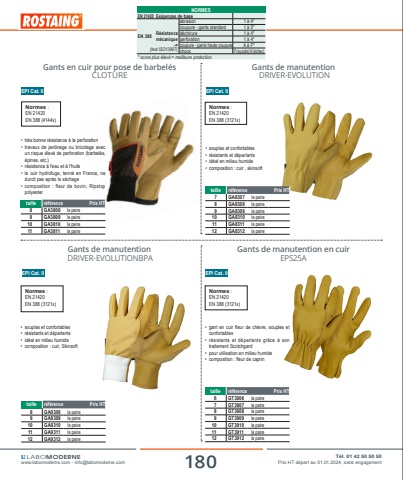 180 T%u00e9l. 01 42 50 50 50www.labomoderne.com - [email protected] Prix HT d%u00e9part au 01.01.2024, sans engagementLABOMODERNEGants de manutention DRIVER-EVOLUTIONBPANormes :EN 21420EN 388 (3121x)%u2022 souples et confortables%u2022 r%u00e9sistants et d%u00e9perlants%u2022 id%u00e9al en milieu humide%u2022 composition : cuir, Skinsofttaille r%u00e9f%u00e9rence Prix HT8 GA9308 la paire9 GA9309 la paire10 GA9310 la paire11 GA9311 la paire12 GA9312 la paireEPI Cat. IIGants de manutention DRIVER-EVOLUTIONNormes :EN 21420EN 388 (3121x)%u2022 souples et confortables%u2022 r%u00e9sistants et d%u00e9perlants%u2022 id%u00e9al en milieu humide%u2022 composition : cuir , skinsoftEPI Cat. IItaille r%u00e9f%u00e9rence Prix HT7 GA8307 la paire8 GA8308 la paire9 GA8309 la paire10 GA8310 la paire11 GA8311 la paire12 GA8312 la paireGants de manutention en cuirEPS25Ataille r%u00e9f%u00e9rence Prix HT6 GT3906 la paire 7 GT3907 la paire8 GT3908 la paire 9 GT3909 la paire10 GT3910 la paire11 GT3911 la paire12 GT3912 la paireEPI Cat. II%u2022 gant en cuir fleur de ch%u00e8vre, souples et confortables%u2022 r%u00e9sistants et d%u00e9perlants gr%u00e2ce %u00e0 son traitement Scotchgard%u2022 pour utilisation en milieu humide%u2022 composition : fleur de caprinNormes :EN 21420EN 388 (3121x)Gants en cuir pour pose de barbel%u00e9sCLOTUREtaille r%u00e9f%u00e9rence Prix HT 8 GA3808 la paire 9 GA3809 la paire10 GA3810 la paire11 GA3811 la paire%u2022 tr%u00e8s bonne r%u00e9sistance %u00e0 la perforation%u2022 travaux de jardinage ou bricolage avec un risque %u00e9lev%u00e9 de perforation (barbel%u00e9s, %u00e9pines, etc.)%u2022 r%u00e9sistance %u00e0 l'eau et %u00e0 l'huile%u2022 le cuir hydrofuge, tann%u00e9 en France, ne durcit pas apr%u00e8s le s%u00e9chage%u2022 composition : fleur de bovin, Ripstop polyesterEPI Cat. IINormes :EN 21420EN 388 (4144x)NORMESEN 21420 Exigences de baseEN 388 R%u00e9sistance m%u00e9caniqueabrasion 1 %u00e0 4*coupure - gants standard 1 %u00e0 5*d%u00e9chirure 1 %u00e0 4*perforation 1 %u00e0 4*coupure - gants haute coupure A %u00e0 F*chocs P(succ%u00e8s)X(%u00e9chec)* score plus %u00e9lev%u00e9 = meilleure protection(test ISO13997)r